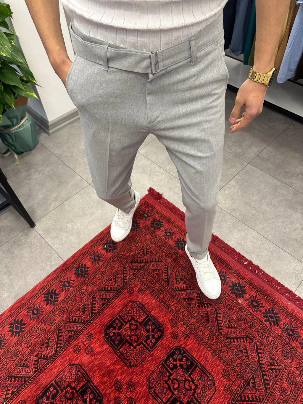 Kendinden Kemerli Duble Paça Kumaş Pantolon Gri