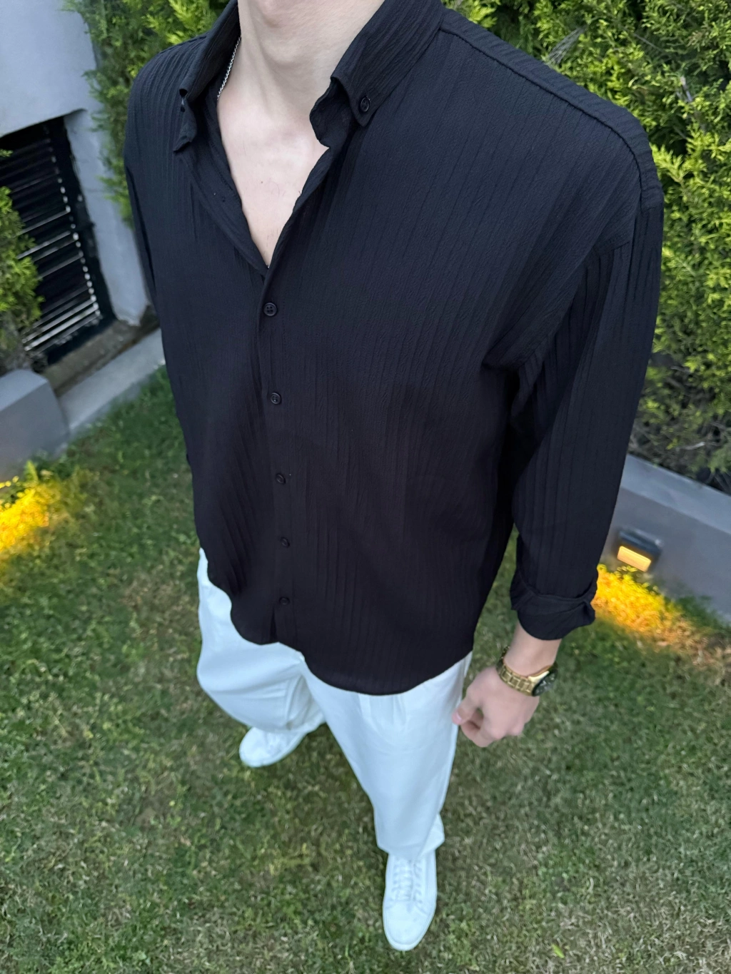 Düğme Detaylı Düz Çizgili Polo Yaka Triko Siyah